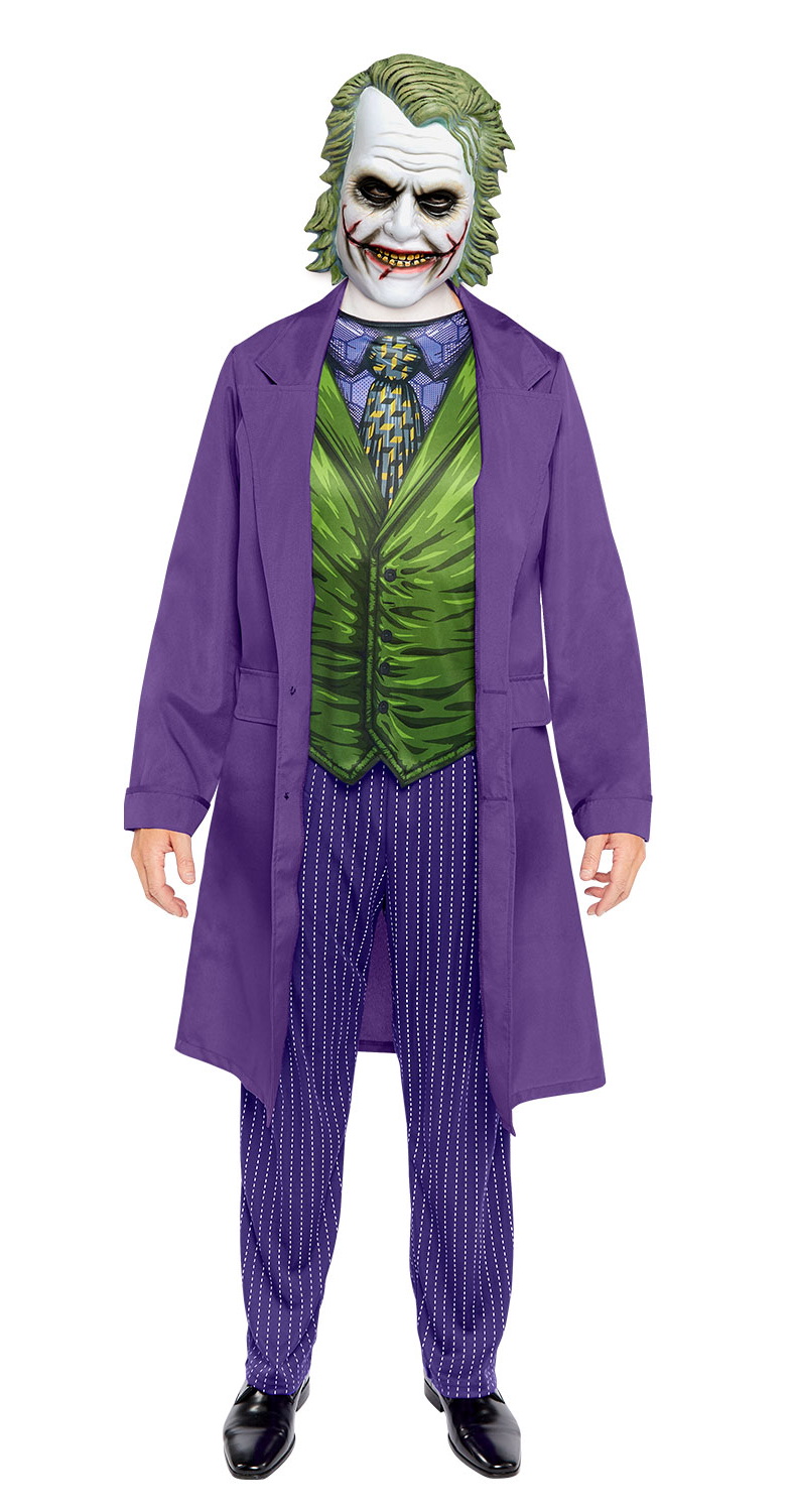 Transform yourself into the sinister villain with our Joker Movie Costume for men . Everything you need to complete your look is included: striped trousers , a long purple coat with a shirt insert , and a terrifying latex mask . You’ll definitely make an impression at your next themed party or Halloween event .