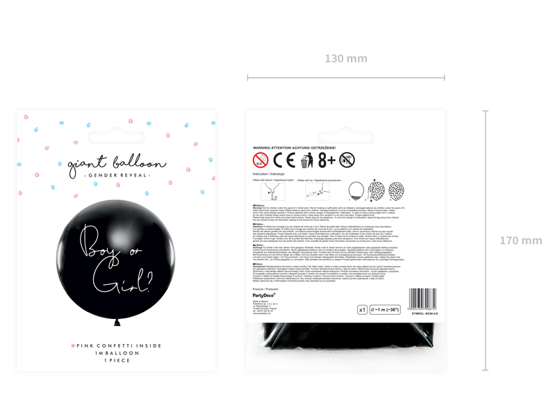 Balloon Gender Reveal – Girl, black with white inscription Boy or Girl, prefilled with pink confetti, diameter approx. 1 m (36”).