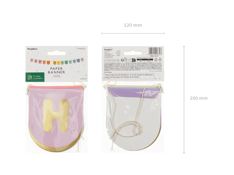Paper banner Happy Birthday, mix of colors. Height approx. 12 cm, string length approx. 2.13 m. Product for self-assembly.