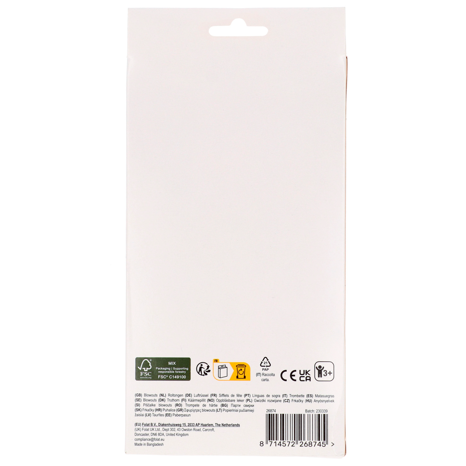 For some extra party! Blowouts – Starburst – 6 pieces. Contains: 6 blowouts. You can use this article for the following party occasion(s): Birthday. These 6 colourful blowouts are printed with the Starburst pattern and have an extra decoration with the text “happy BIRTHDAY”. When rolled out, the blowouts are 28 cm. The mouthpiece is white and 6 cm long. The roll part is 4 cm wide and 22 cm long (unrolled). When rolled up, the blowouts are approximately 11 cm. These blowouts are part of the Starburst collection from Folat. This item is made of FSC paper.