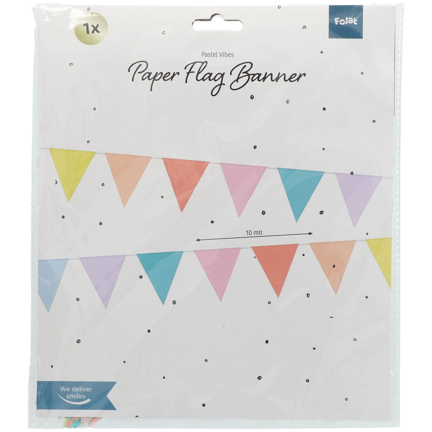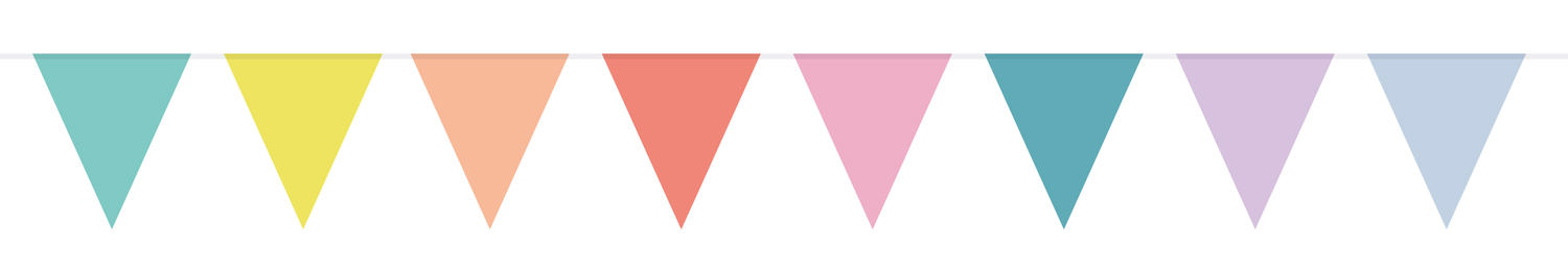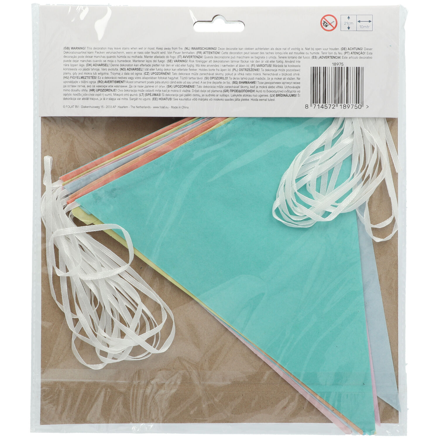 Bunting Garland Pastel Multi Colors – 10 m. Contents: 1 garland. Colour: Multicolour. You can use this article for the following party occasion(s): Birthday, Children’s party and Anniversary. This garland is 10 meters long. This article is made of paper.