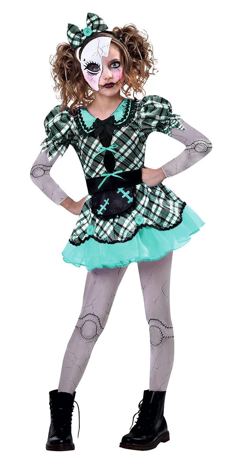 This girl’s broken doll costume features a turquoise plaid dress with ruffles and decorative buttons. The long sleeves are sewn onto the short puff sleeves. Gray patterned tights , a creepy half mask , and a headband with a matching bow complete this creepy yet cute costume. A perfect costume for Halloween and costume parties.