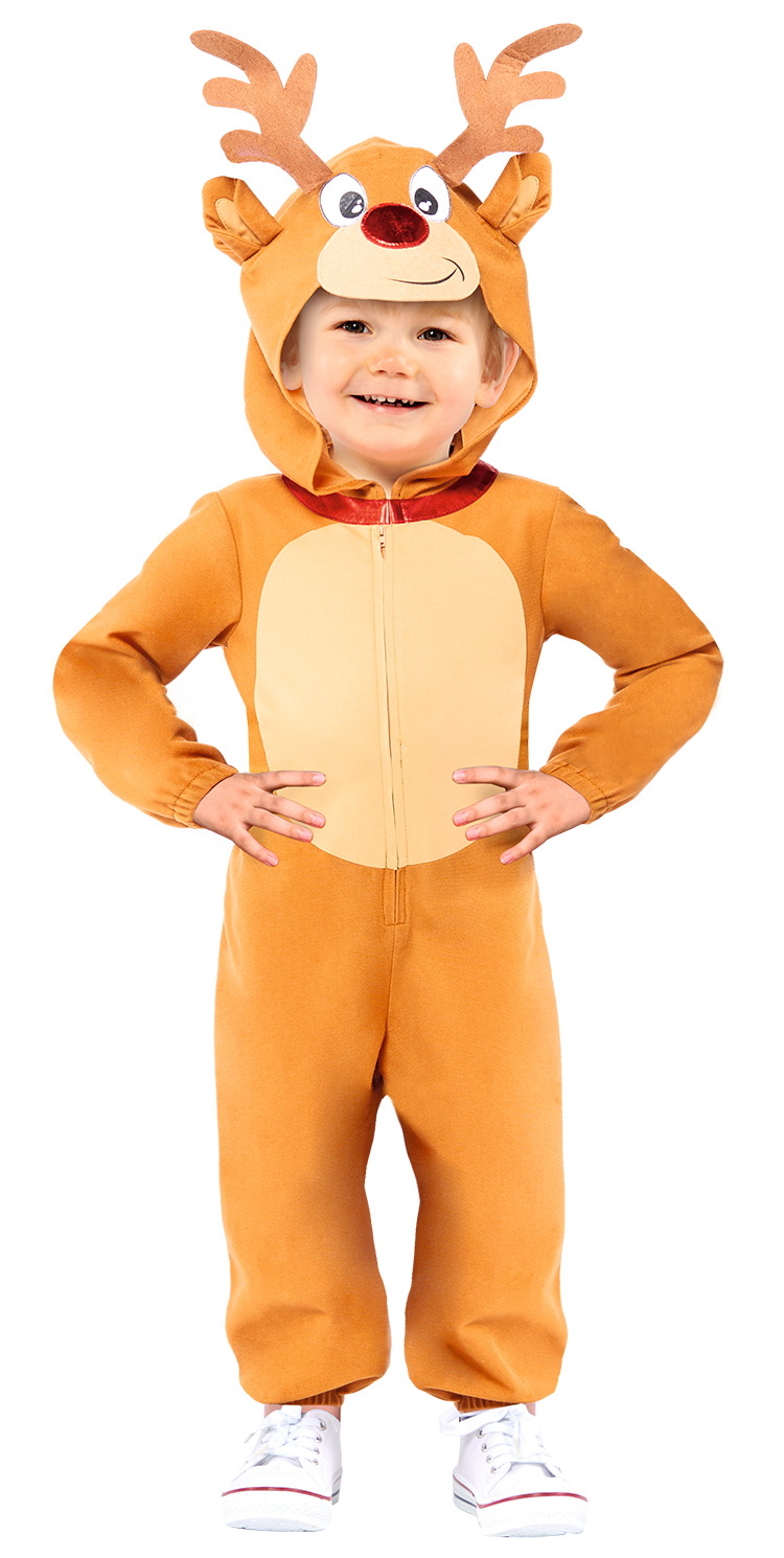 This cute little onesie is perfect for joining in on the reindeer games! A full one-piece onesie with zip up the middle, red metallic collar, and cute Rudolph-face on the hood with antlers and ears.