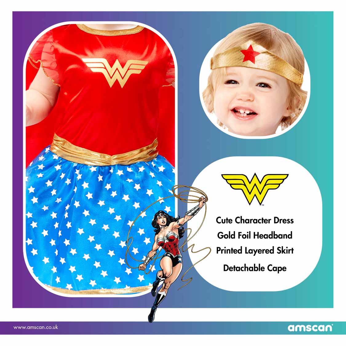 Includes: Printed dress & cape. Velcro release cape. Gold foil printed chest logo.