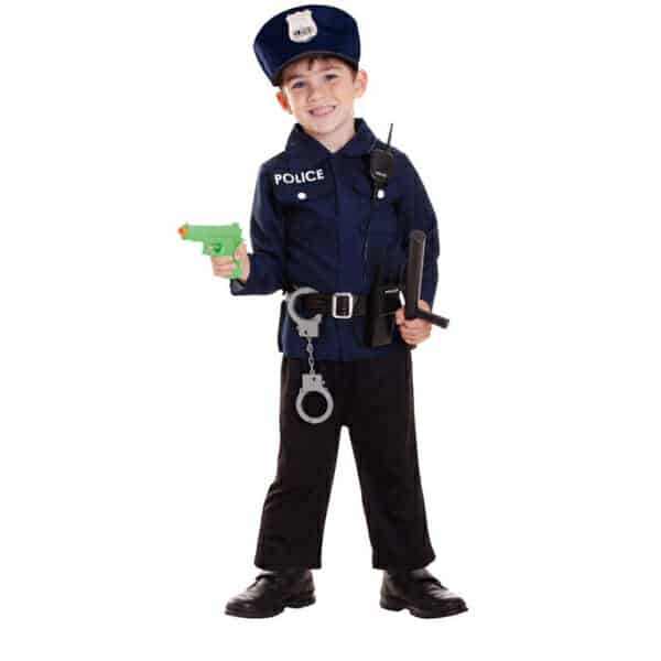 This Police costume includes tunic, belt, Cap, nightstick, pistol, handcuffs and walkie talkie.