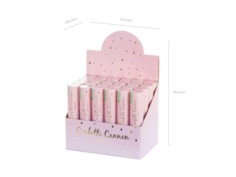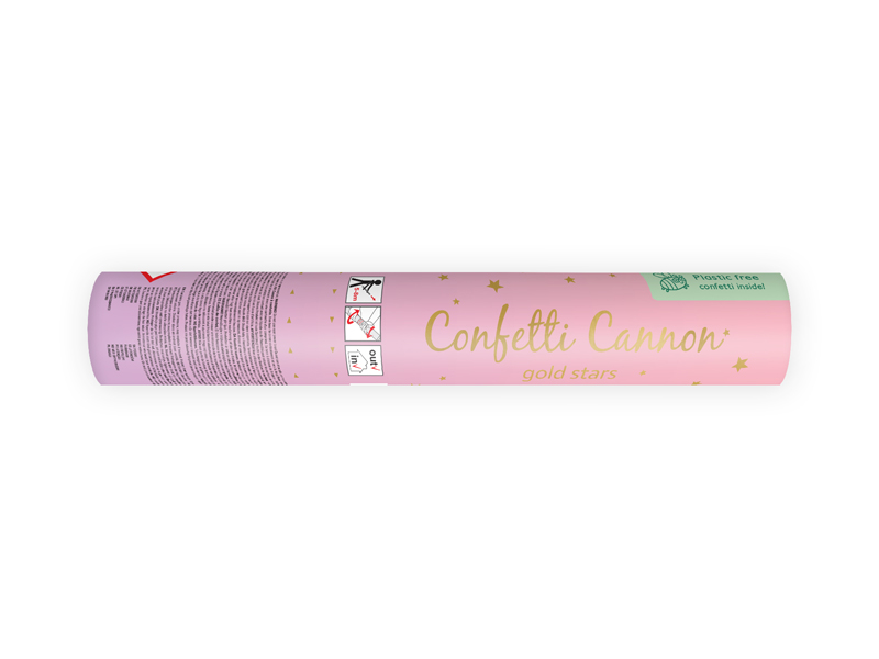 Confetti cannon with golden stars. The length of the tube is 20cm. The confetti cannon is not a firework it contains compressed air. Shooting range: 5-8 meters.