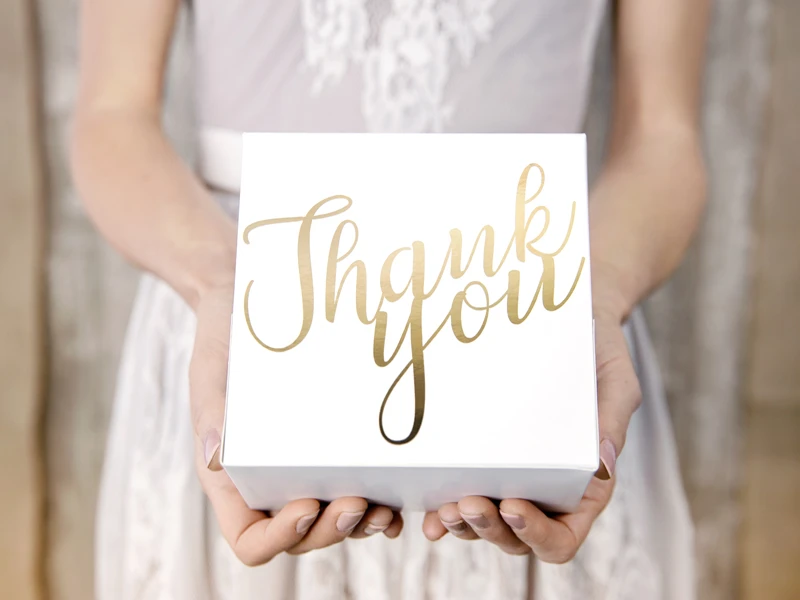 Decorative cake boxes made of white paper with gold metallic inscription Thank you. Size after assembling approx. 14 x 8.5 x 14cm. (1 pkt / 10 pc.)