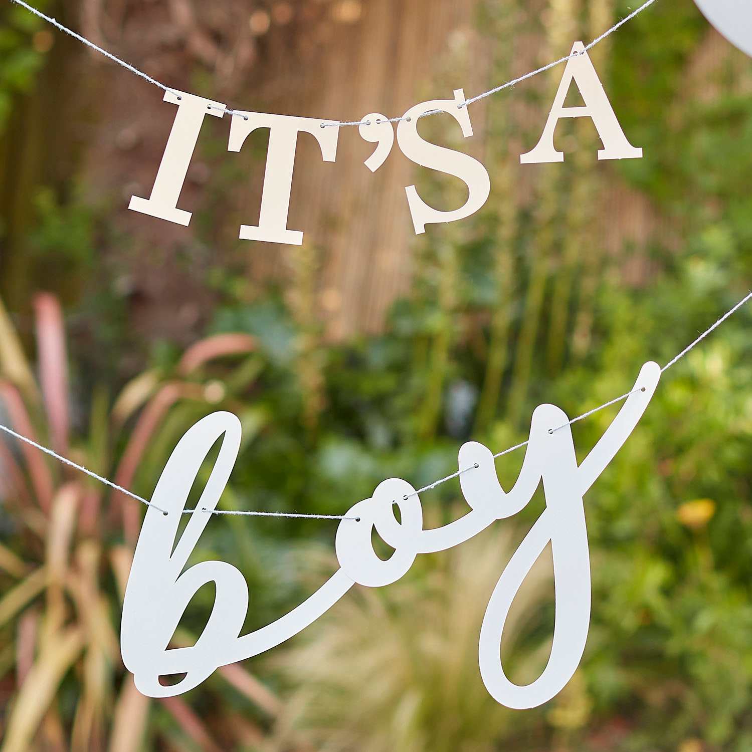 Style your baby shower or gender reveal party with this pretty ‘It’s A Boy’ bunting. Decorated with a stylish white and baby blue colour scheme, this baby shower bunting is perfect for decorating in your home or at a venue for a lovely display.