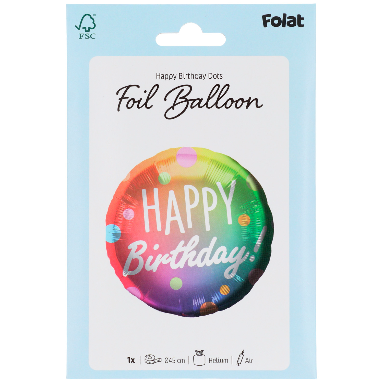 Foil Balloon ‘Happy Birthday!’ Dots Multi Colors – 45cm. Contents: 1 Foil Balloon. Colour: Multi Colors. You can use this article for the following party occasion(s): Birthday, Teenagers’ party and Children’s party. The foil balloon is 18 inch/45 cm. The article is made of foil.