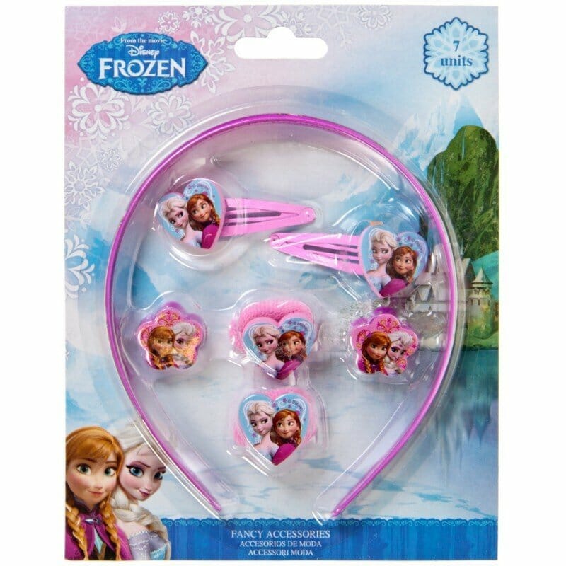 Pack of 7 Hair Accessories – 1 Plastic Hairband, 2 Elastic with Frozen Icons, 2 Shark Clips with Icons & 2 Snap Clips