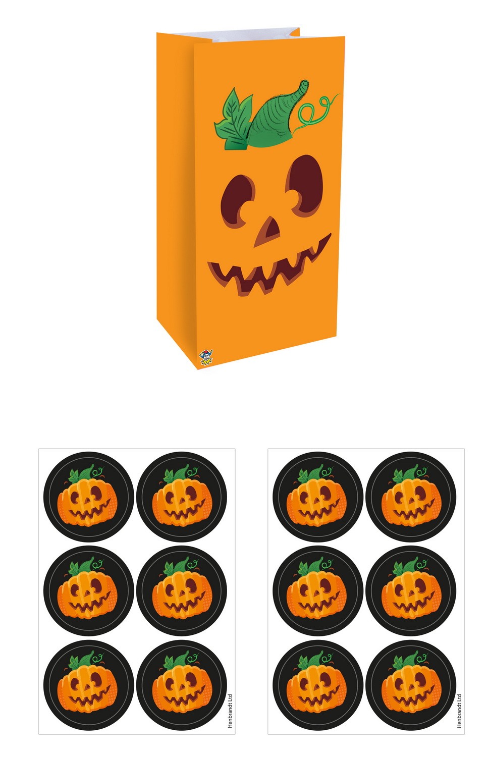 Halloween Pumpkin Paper Party Bags with Stickers (13x25x8cm) – 12pk