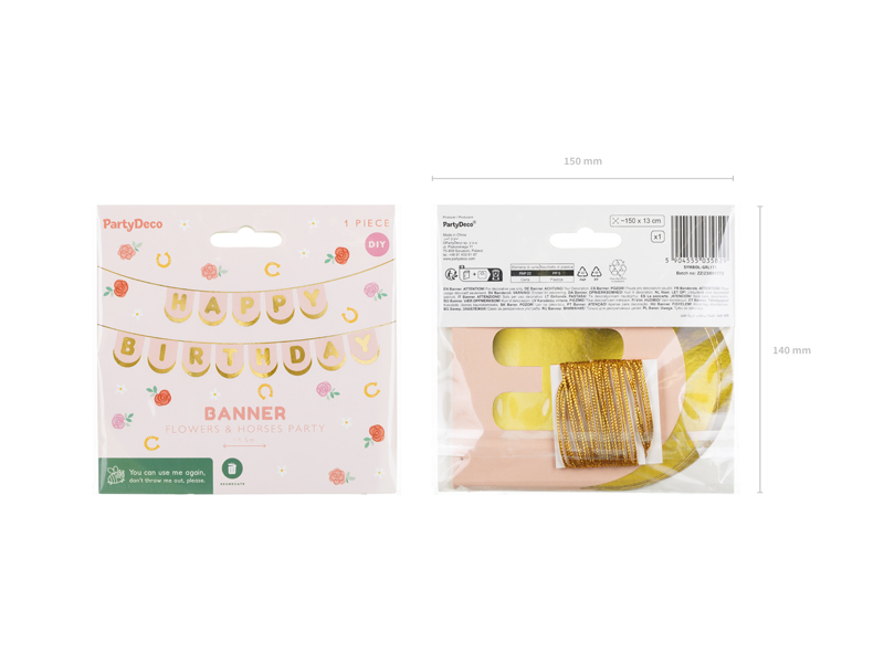 Horses banner in light pink with gold Happy Birthday inscription, made of paper, dimensions of the string about 2.5 m. dimensions after folding: height about 13 cm, length about 150 cm.