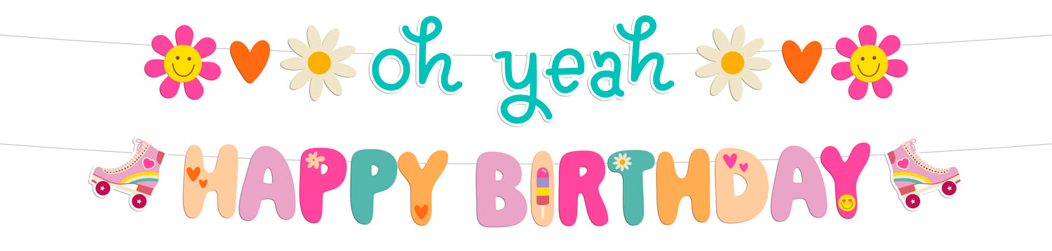 Oh yeah! Letter Banner Set – “Oh yeah Happy Birthday” – Boho Girlz – 1,5 meter . Contains: 1 Letter Garland Set. You can use this article for the following party occasion(s): Birthday, Children’s party. A super cheerful Letter Garland Set to get everyone in the right party mood. The garland has two parts: a part with the text: “Oh yeah” with a smiling flower, a heart and a daisy on either side, and a part with the text “Happy Birthday” with a roller skate on either side. The symbols and letters have a height of 15 cm and can be slid back and forth over the white ribbon. Both streamers are 1.5 meters long. This Letter Garland Set is part of the Boho Girlz collection from Folat. This item is made of FSC paper.