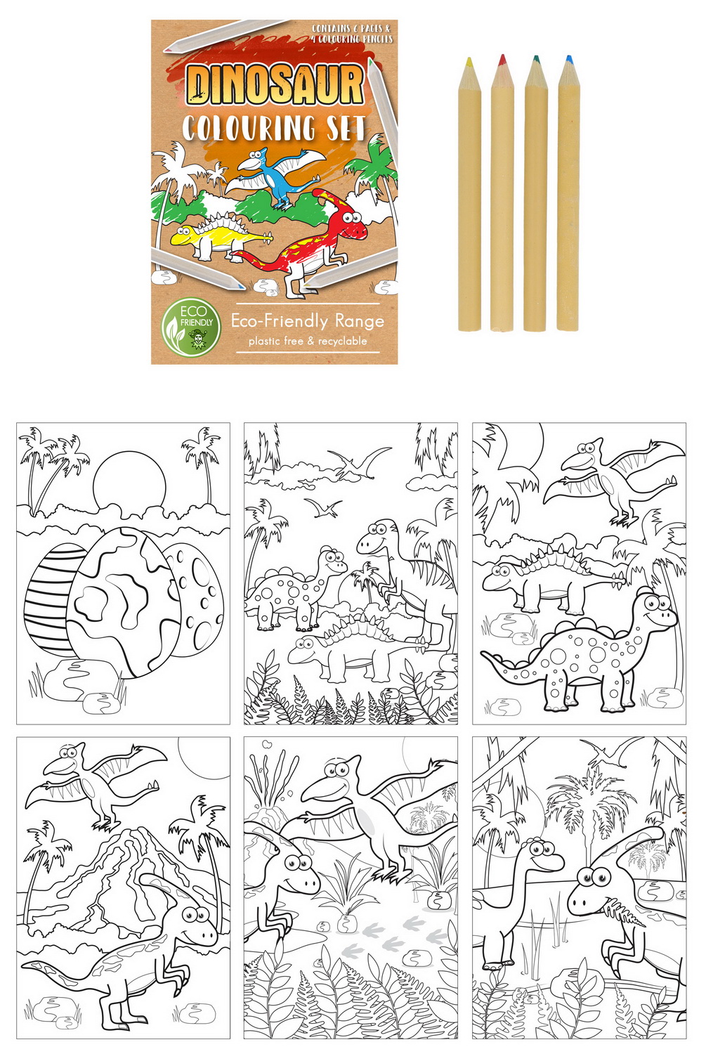 This eco-friendly mini colouring set includes 6 Dinosaur colouring sheets and 4 mini colouring pencils. Please note: these sets use combination eco packaging consisting of external paper wrappers + recyclable plastic pencil packs. Size: A6 / 14cm x 10cm.