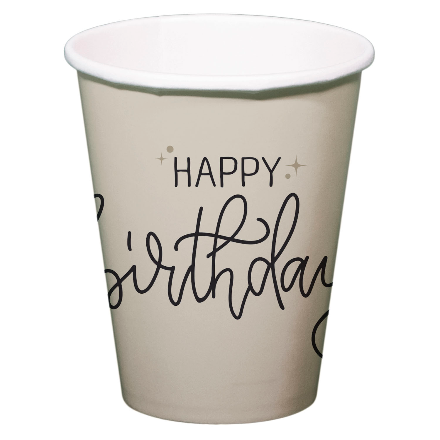 For stylish toasts. Cups – Crème Noir – 250 ml – 8 pieces. Contains: 8 cups. You can use this article for the following party occasion(s): Birthday. Paper cups with the text “HAPPY birthday”. The attractive design with cream, black and the combination of straight and elegant letters make these cups both neutral and festive. Suitable for birthdays all year round. These cups are part of Folat’s Crème Noir collection. This item is made of FSC paper.