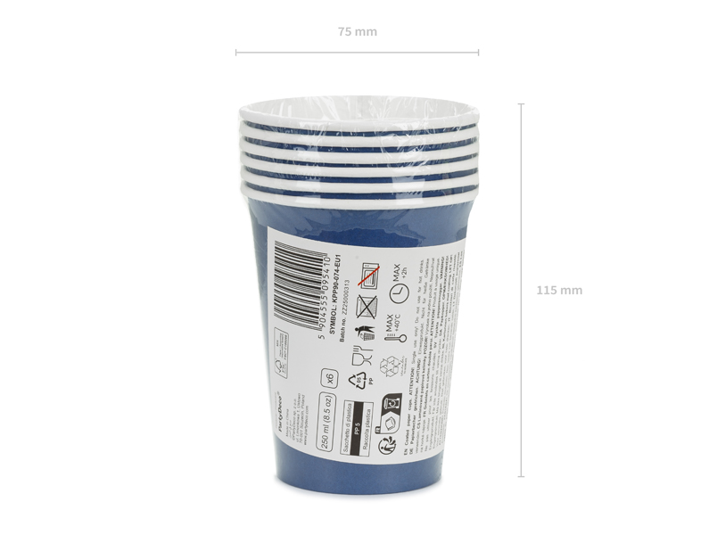 Paper cups in dark blue color. Height approx. 9 cm, capacity approx. 250 ml (8.5 oz). Disposable product. Do not use for hot drinks.The cups contain markings required by the Commission Implementing Regulation (EU) 2020/2151 of 17 December 2020 laying down rules on harmonized specifications regarding the labeling of single-use plastic products listed in Part D of the Annex to Directive (EU) 2019/904 on the reduction of the impact of certain plastic products on the environment. The product contains a label in Polish, English, Maltese, Swedish, Finnish, Danish, Italian, and Lithuanian only. (1 pkt / 6 pc.)