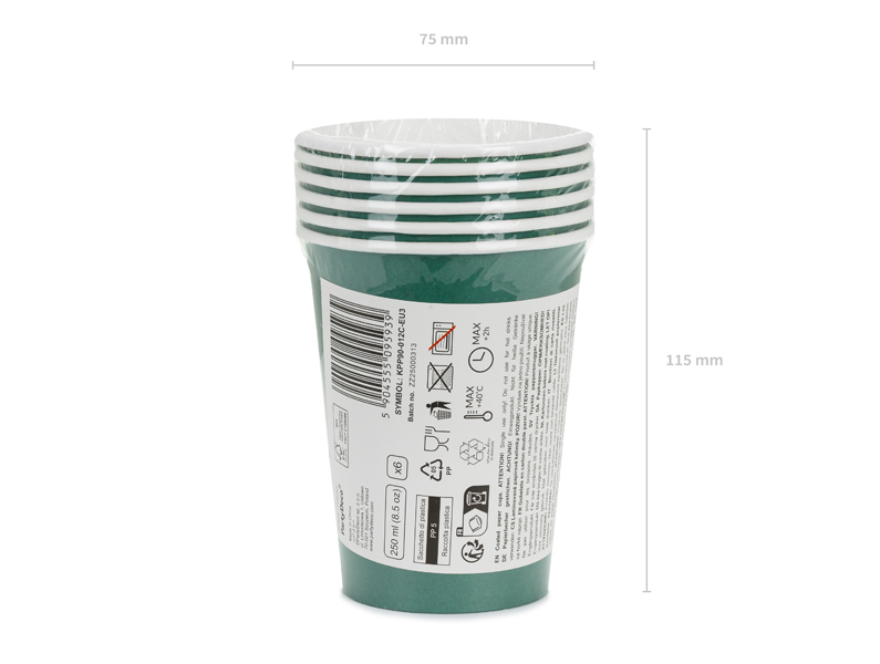 Paper cups in dark green color. Height approx. 9 cm, capacity approx. 250 ml (8.5 oz). Disposable product. Do not use for hot drinks.The cups contain markings required by the Commission Implementing Regulation (EU) 2020/2151 of 17 December 2020 laying down rules on harmonized specifications regarding the labeling of single-use plastic products listed in Part D of the Annex to Directive (EU) 2019/904 on the reduction of the impact of certain plastic products on the environment. The product contains a label in Polish, English, Maltese, Swedish, Finnish, Danish, Italian, and Lithuanian only. (1 pkt / 6 pc.)