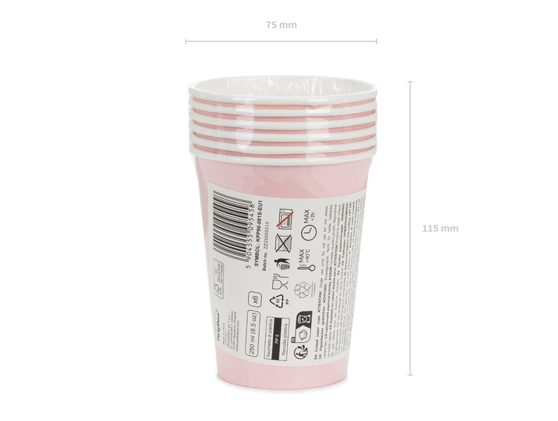 Paper cups in light pink color. Height approx. 9 cm, capacity approx. 250 ml (8.5 oz). Disposable product. Do not use for hot drinks.The cups contain markings required by the Commission Implementing Regulation (EU) 2020/2151 of 17 December 2020 laying down rules on harmonized specifications regarding the labeling of single-use plastic products listed in Part D of the Annex to Directive (EU) 2019/904 on the reduction of the impact of certain plastic products on the environment. The product contains a label in Polish, English, Maltese, Swedish, Finnish, Danish, Italian, and Lithuanian only. (1 pkt / 6 pc.)