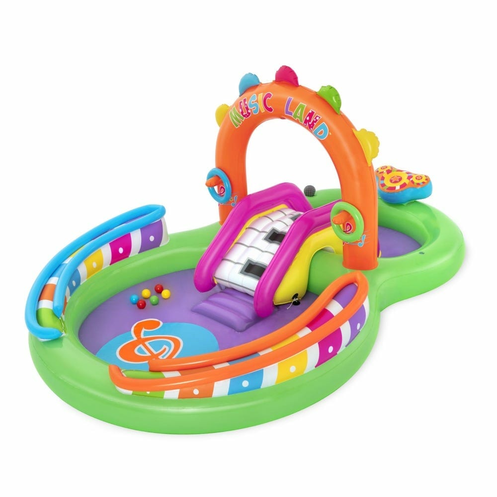 Let it rock this summer with the Sing ‘n Splash water play center from Bestway®! Thanks to the many play options and the inflatable musical instruments, children can explore their musical side and splash around in the sun. The game center contains a microphone and drum to play with, which stimulates their imagination. The double pools offer several play areas and are connected by a removable slide. The pool floor has an inflatable landing cushion for extra comfort when sliding down. The arc of the play center contains a sprinkler that gets the kids and the slide wet. There is also a fun ring toss game. In addition, the children can let the balls roll along the two lanes outside the play center. In this way, they can train their coordination skills and dexterity with a lot of fun. Just attach a garden hose and the fun begins!