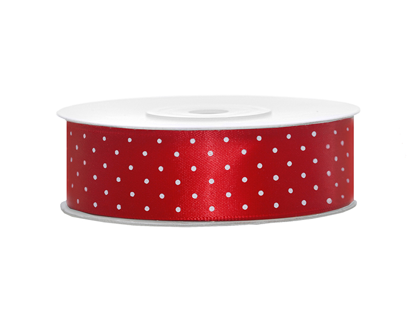 Satin ribbon, red, with white dots, width 25 millimeters, sold by the meter