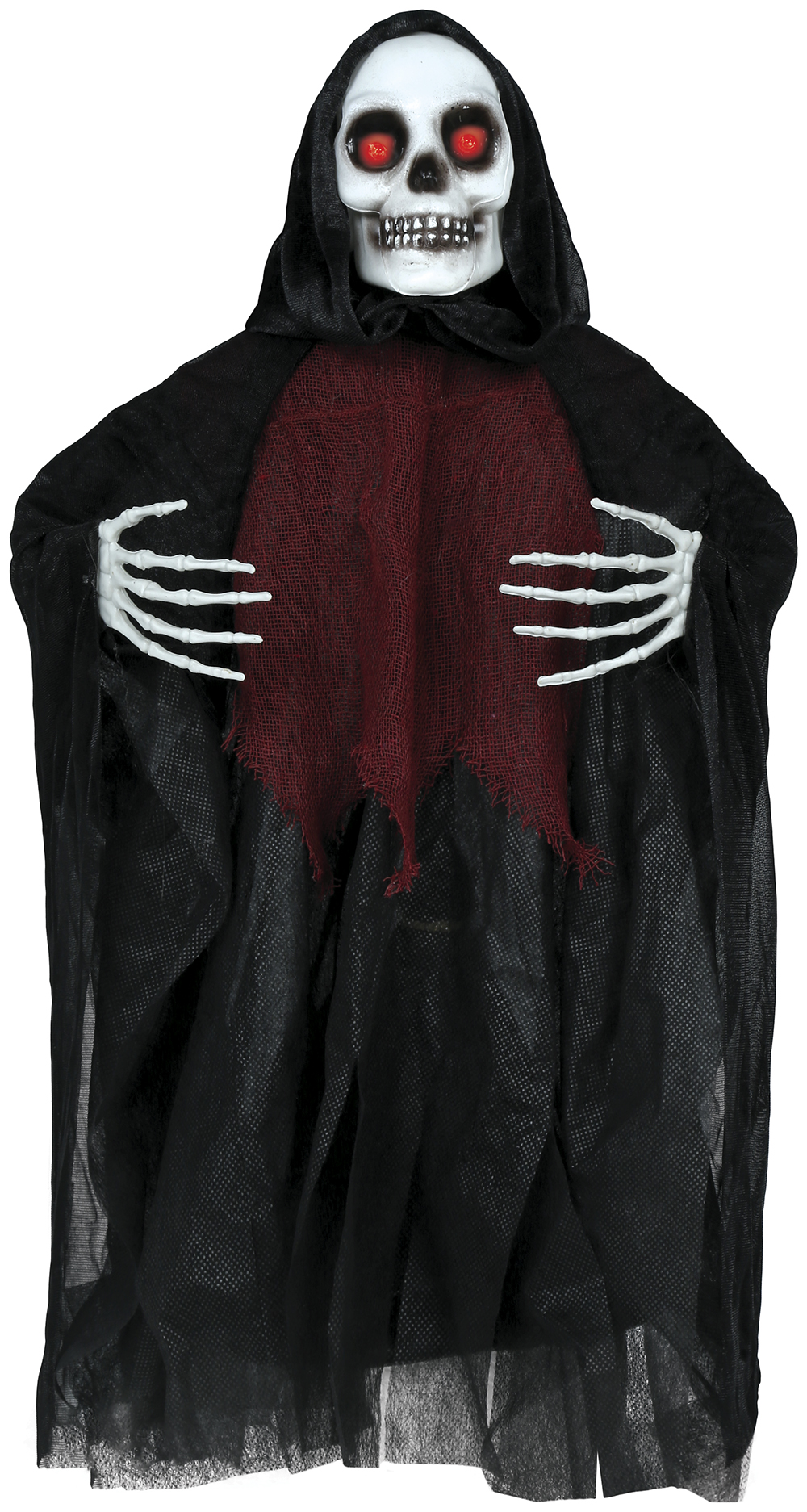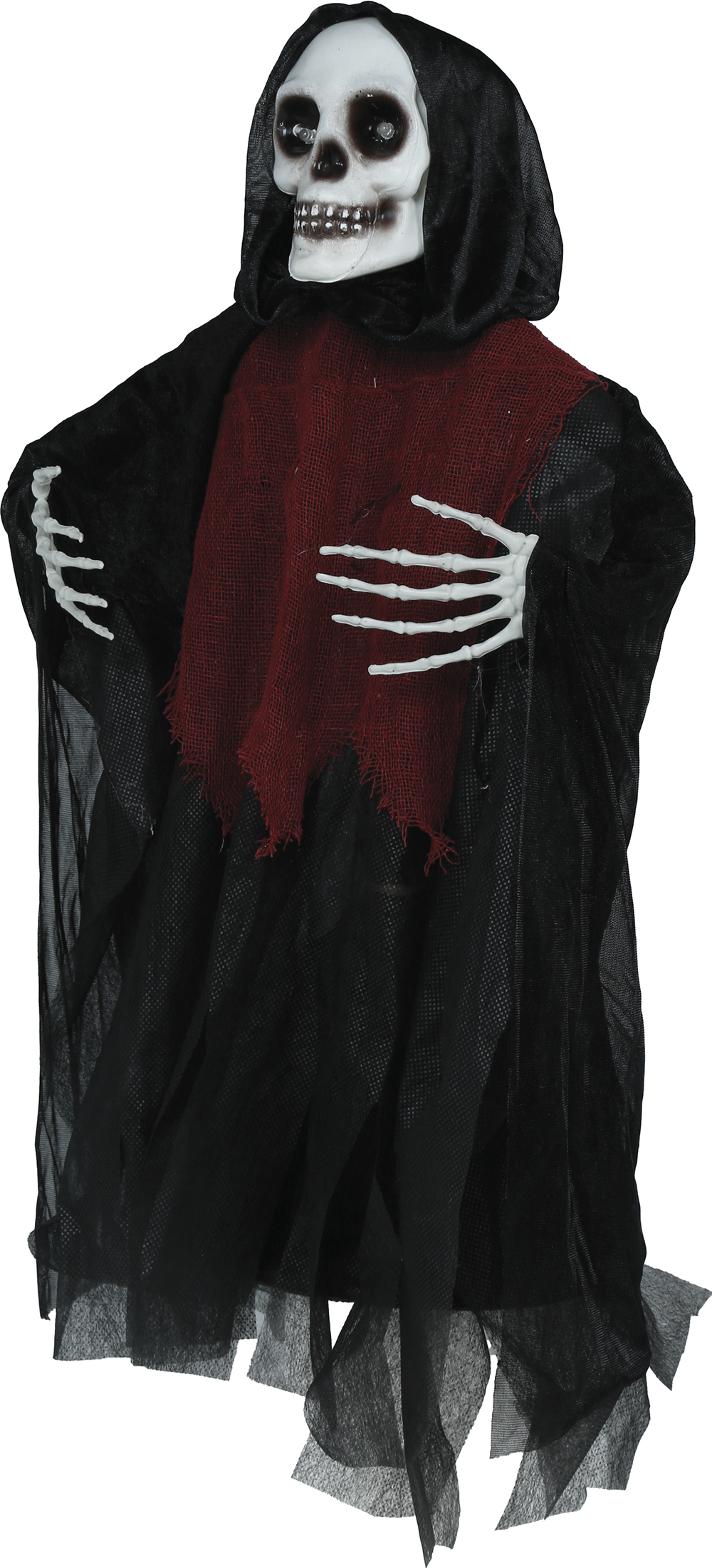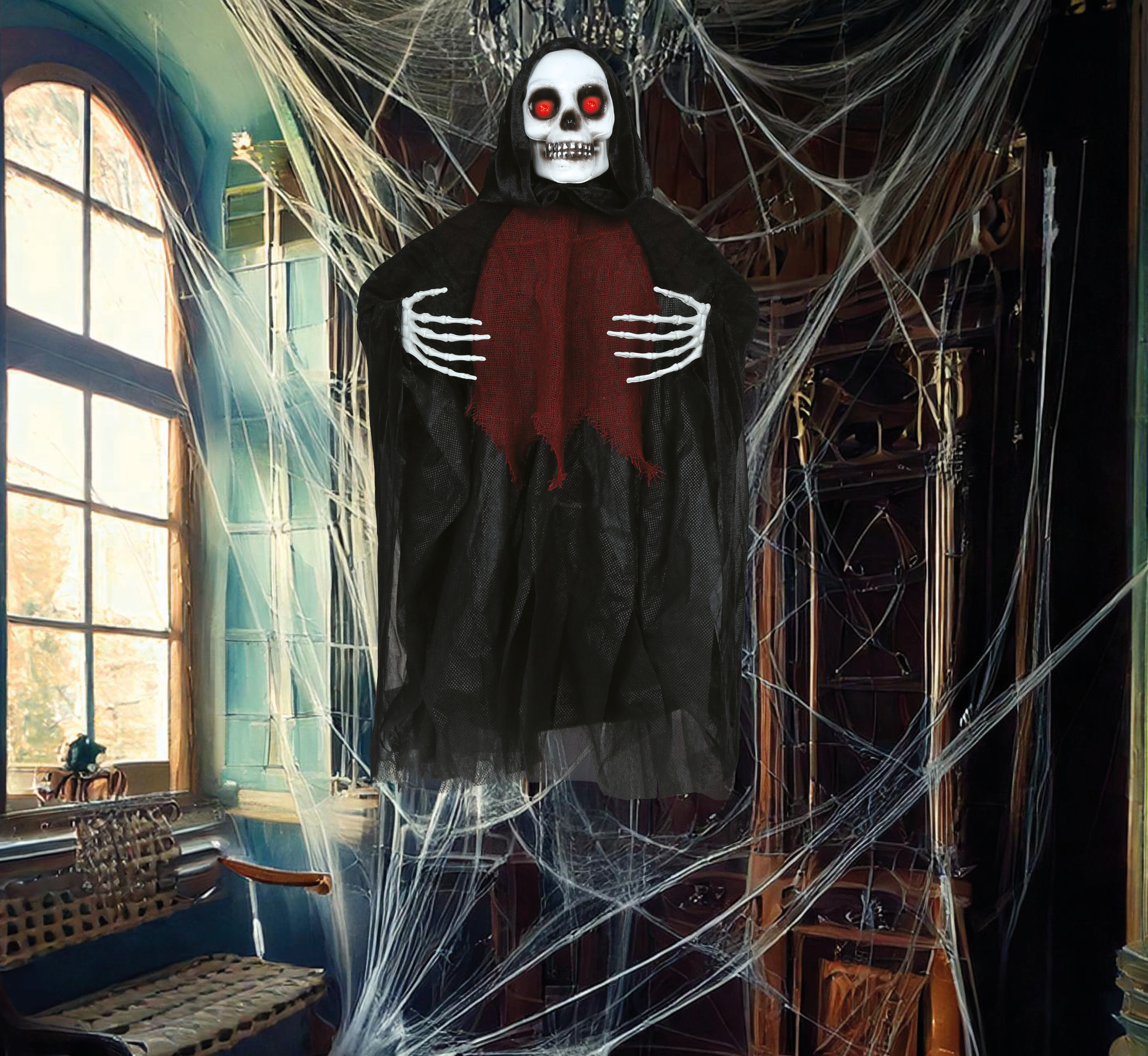 But that’s not all – this fantastic decoration also features eerie lights and spine-tingling sound effects that will truly bring your haunted scene to life. Imagine the screams of your guests as they encounter this terrifying skeleton hanging in the shadows, ready to surprise and delight.
