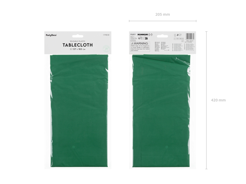 Tablecloth in dark green color. Size approx. 137 x 183 cm. Made of synthetic material.
