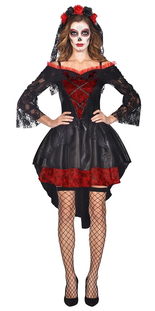 The Lucille Day of the Dead women’s costume features a dress with lace sleeves and scalloped hems. The black bridal veil is complemented by floral appliques. Your costume will look especially beautiful when complemented with black fishnet tights. This sexy costume will turn heads at any Halloween , Day of the Dead , or Carnival party .