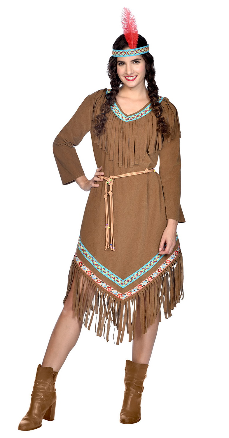The high-quality Etenia Native American costume for women consists of a figure-hugging, leather-look dress with fringe trim and beautiful gemstone appliqués, a matching belt , and a headband adorned with gemstones . A great costume for various costume events and themed parties.