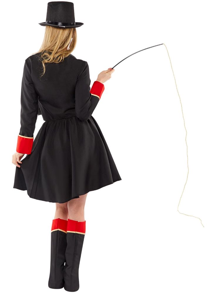 The Circus Director Tatiana women’s costume consists of a jacket with sewn-in vest , a skirt , matching leg warmers, hat and whip .