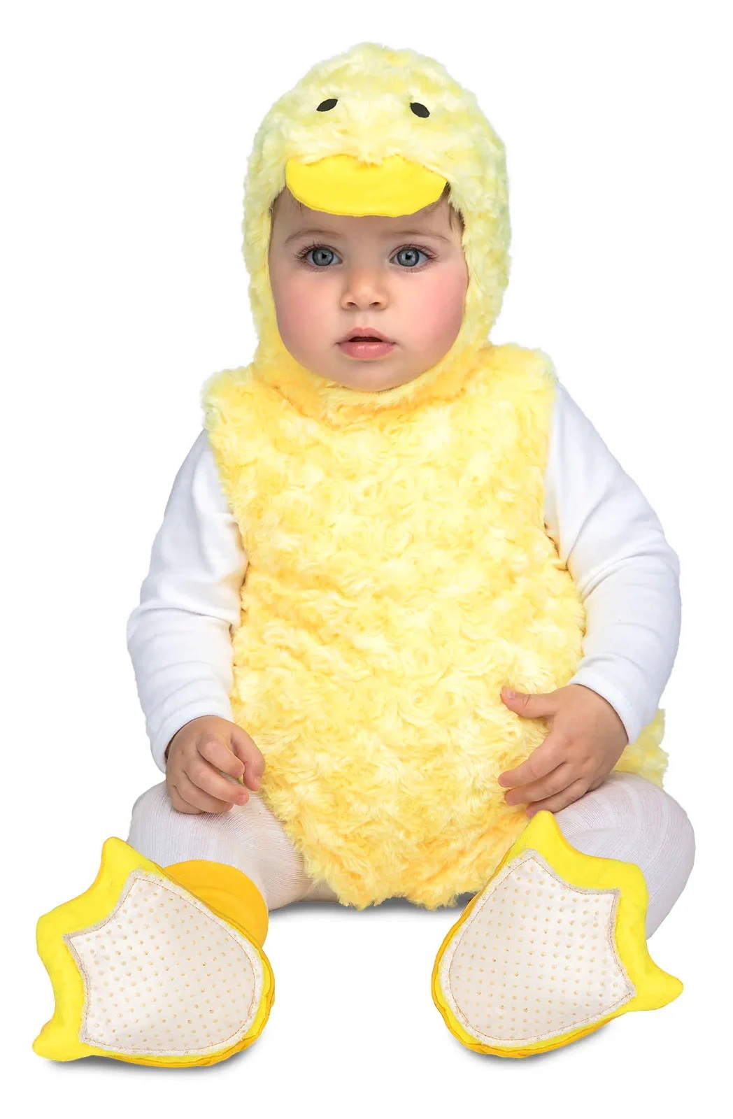 Yellow duck costume, consisting of hat with eyes and beak, sleeveless tunic with a soft texture and booties in the shape of little duck feet.