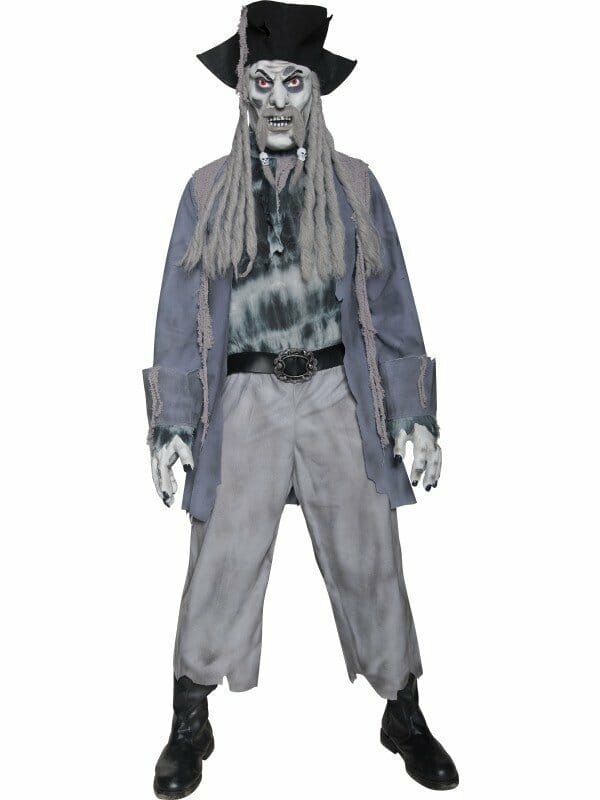 Zombie Ghost Pirate Costume Grey Top Trousers Hat with Dreadlocks Mask & Gloves