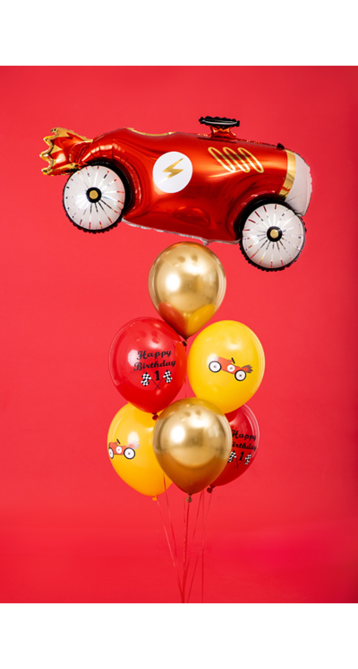 Strong Balloons Happy Birthday, set contains 6 balloons (2 in pastel Honey Yellow colour with coloful print, 2 in pastel Poppy Red colour with white and black print, 1 in pastel Baby Blue colour and 1 in Glossy gold colour), diameter approx. 30 cm. (1 pkt / 6 pc.)