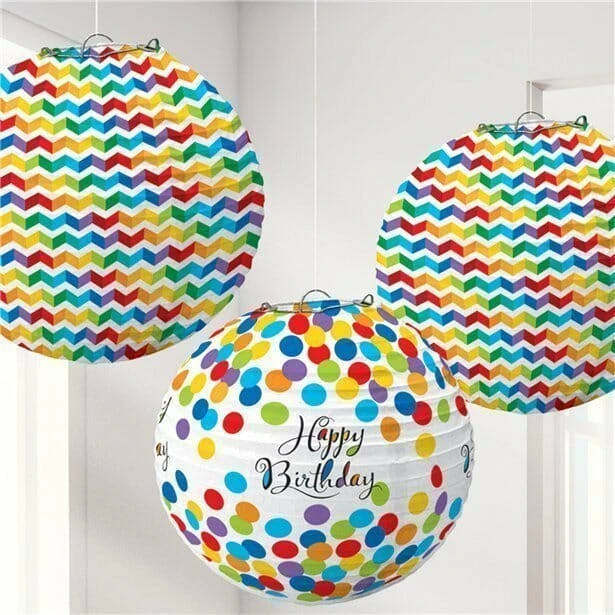 Add a pop of color to your decorations with these Bright Dot & Chevron Birthday Paper Lanterns. Two white paper lanterns are covered in rainbow chevron print, while the other lantern is printed with the headline “Happy Birthday” surrounded by colorful dots. These rainbow dot and chevron decorations arrive flat but easily expand into round lanterns with the included metal frames. Set the scene for a festive rainbow birthday party with these colorful paper lanterns. Includes: Strings for handing. NOTE: Lanterns are for decorative purposes only. Do not hang over light bulbs or near open flames.