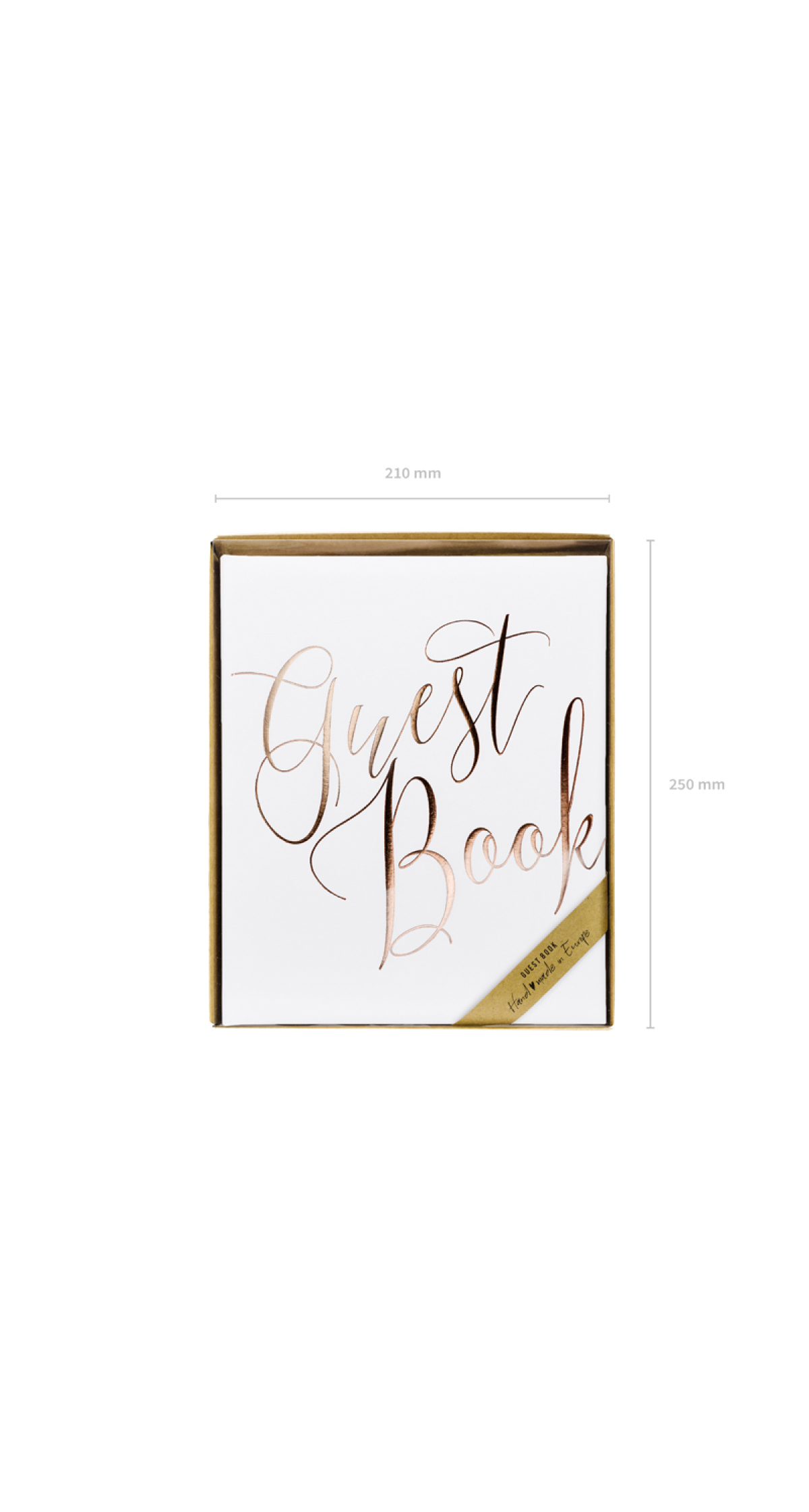 Guest book bound in white paper with a rose gold inscription, size approx. 20 x 24.5 cm 22 pages, without text.
