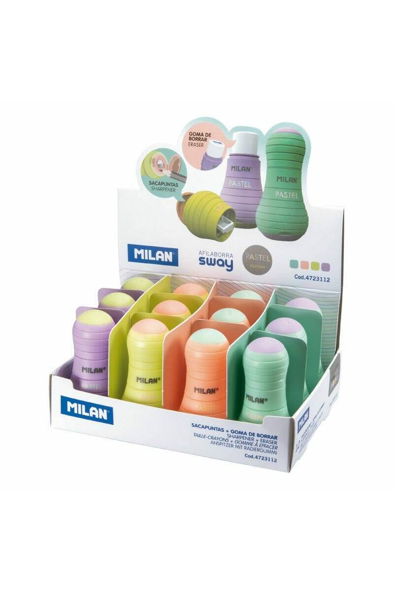 Combination of eraser and pencil sharpener with deposit. SWAY design, Pastel edition. The pencil sharpener has a sharp and resistant steel blade which makes it ideal for all varieties of pencils. Safety blade systemwhich prevents the blade from becomingdetached from the body of the pencil sharpener. 4 assorted colours: yellow, orange, lilac and turquoise.Original design created by MILAN’s own R+D department.