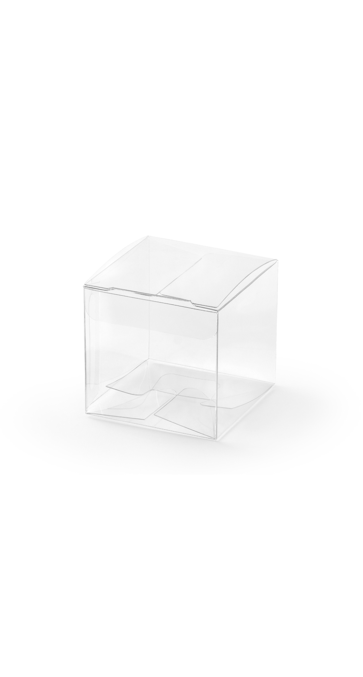 Square boxes made of transparent foil. Size after assembling: width approx. 5cm, height approx. 5cm, depth approx. 5cm. (1 pkt / 10 pc.)