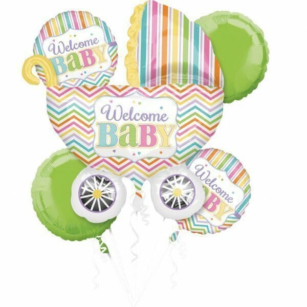 Pack of 5 Foil Balloons, x1 Super Shape 28″ x 31″ (71cm x 78cm), x2 Standard Welcome Baby Circles 17″, x2 Standard Lime Circle 17″ (43cm)