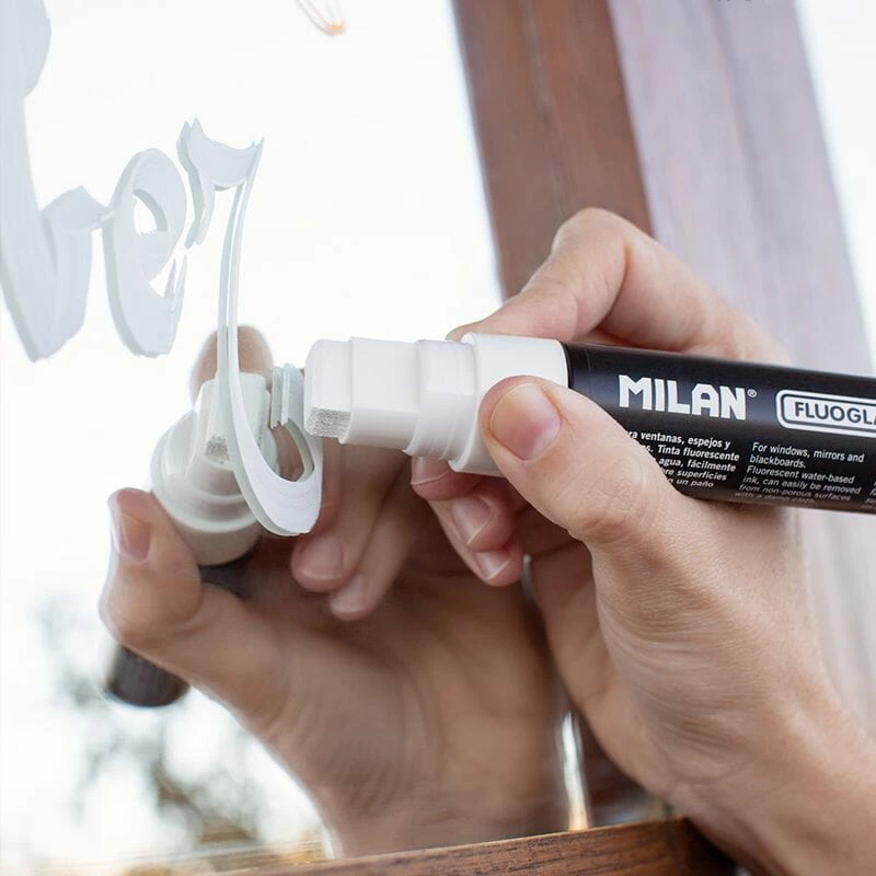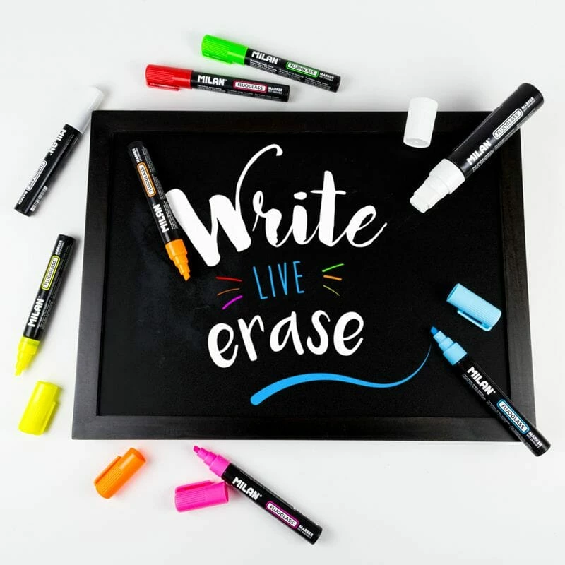 Markers for smooth, non-porous surfaces (windows, mirrors, whiteboards,etc.). White. 8 – 15 mm flat tip. Water-based ink which is easily erased with a damp cloth. The colours retain their bright intensity due to their high concentration of pigments.