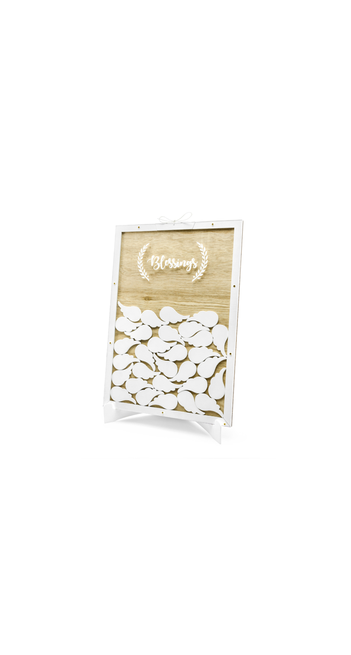 Wooden guest book with white inscription Blessings, set contains guest book in the shape of rectangle and 30 white wings to write in, size approx. 27.5 x 39.5 cm.